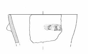 Orlo di forma arrotondata, pareti rettilinee. Tre bugnette irregolarmente sferiche poste poco sotto l'orlo. Colore: marrone grigio.
