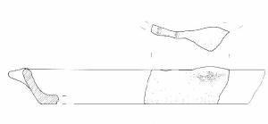 Orlo di forma arrotondata, decorato a impressioni digitali; fondo piano. Presa a linguetta triangolare impostata in corrispondenza dell'orlo. Colore: beige.