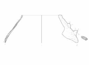 Orlo di forma arrotondata; profilo biconico. Ansa nastriforme.\nColore: grigio beige con colpi di fiamma arancioni.