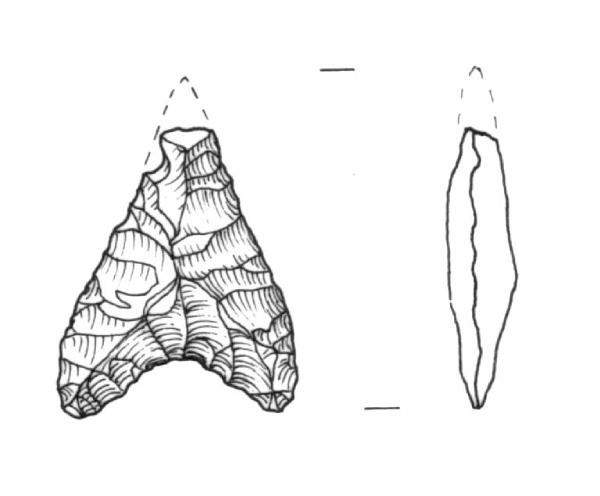 Punta foliata ad alette convergenti. Margini convessi verso le alette, rettilinei verso la punta, denticolati. Sezione piano-bombata.