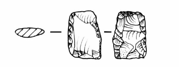 Raschiatoio foliato multiplo, ritocco coprente sulla faccia ventrale e marginale su quella dorsale, bifacciale. Margine inferiore rettilineo, margini laterali destro irregolarmente bombato, sinistro rettilineo, margine superipore rettilineo. Sezione biconvessa.