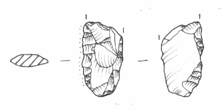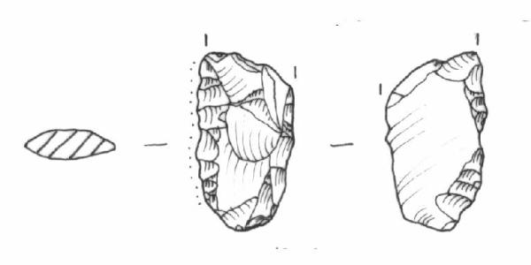 Raschiatoio foliato multiplo, ritocco coprente sullla faccia dorsale, marginale sul lato destro della faccia ventrale. Margine inferiore convesso, margini laterali leggermente convessi. Sezione biconvessa.