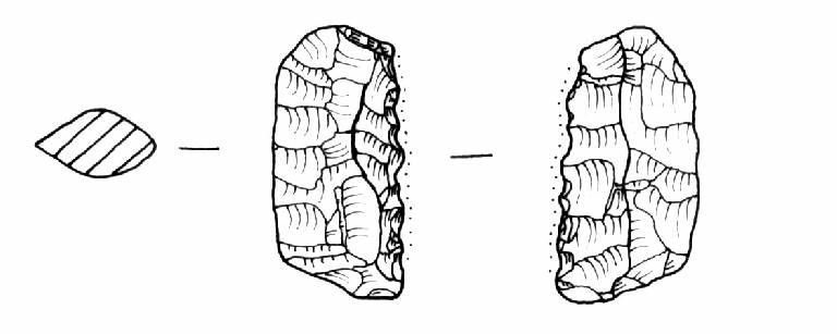 Raschiatoio foliato multiplo, ritocco coprente, bifacciale. Margine inferiore rettilineo obliquo, superiore convesso, margine laterale convesso, destro rettilineo-denticolato. Sezione bombata.