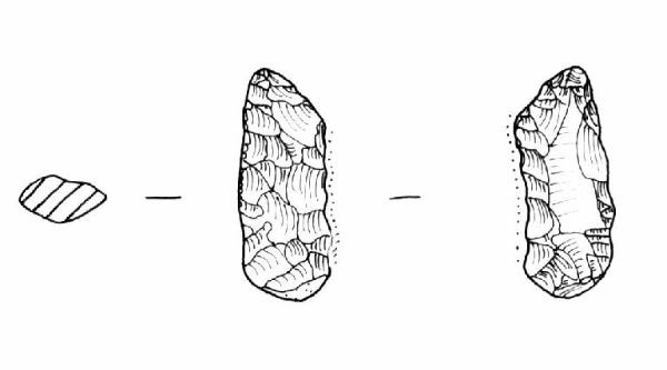Raschiatoio foliato multiplo, ritocco coprente, bifacciale. Margine inferiore convesso e superiore obliquo, margini laterali rettilinei, il sinistro sinuoso. Sezione bombata.