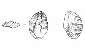 Ritocco piatto, coprente, bifacciale. Larghezza massima circa a metà della lunghezza. Sezione biconvessa irregolare.
