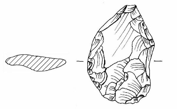 Grattatoio frontale, ritocco piatto, coprente, bifacciale. Profilo irregolare, parte utile arrotondata. Sezione irregolare appiattita