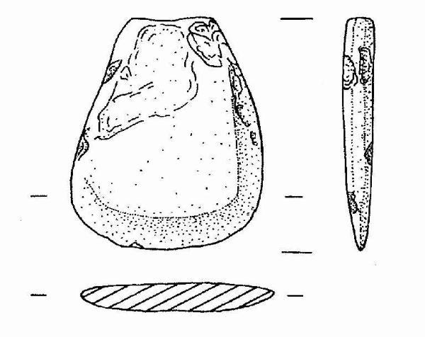 Ricavata da scheggia. Il corpo è completamente levigato e presenta un piano di levigatura lungo uno dei lati maggiori. Il tallone è stato tagliato e lisciato.