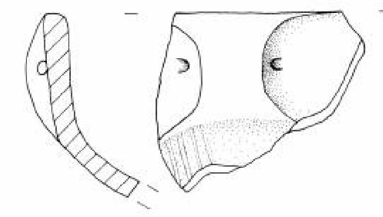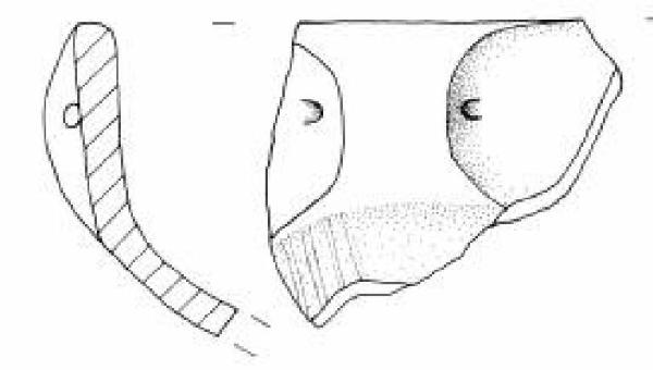 Orlo piatto, parte superiore rettilinea con ansa canaliculata. Vasca emisferica decorata con un fascio obliquo di quattro sottili solcature.