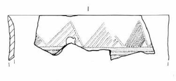 Tre frammenti con orlo arrotondato assottigliato. Parete superiore rettilinea decorata con un fascio di solcature orizzontali sopra la carena su cui poggia una teoria di denti di lupo campiti con solcature oblique.