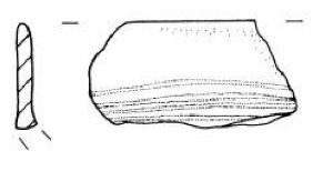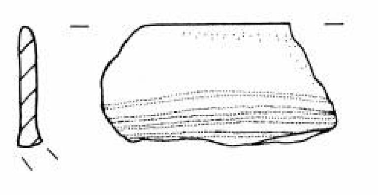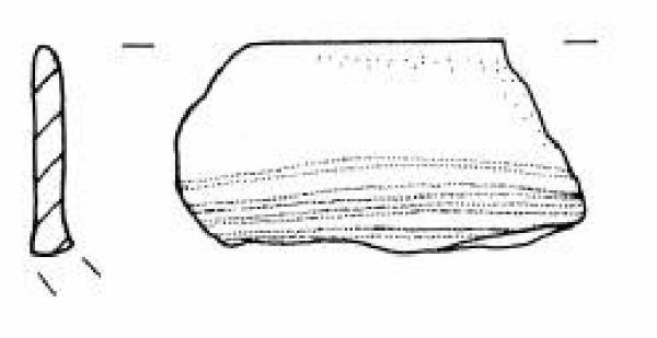 Due frammenti con orlo arrotondato. Parete superiore rettilinea decorata con un fascio di quattro sottili solcature orizzontali irregolari.