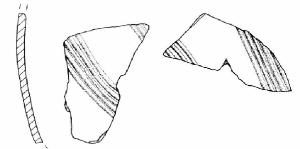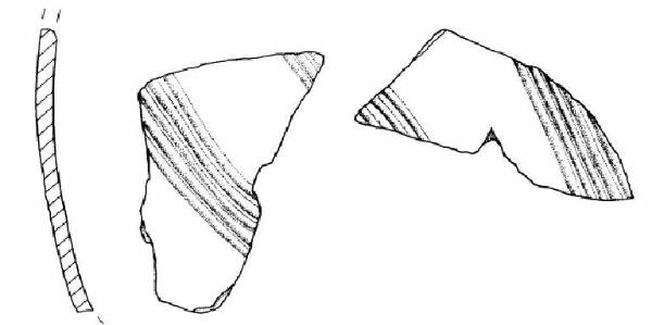 Due frammenti con vasca a calotta decorata con tre fasci obliqui paralleli di cinque solcature.