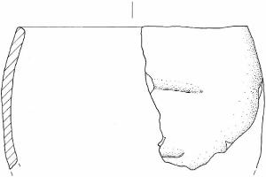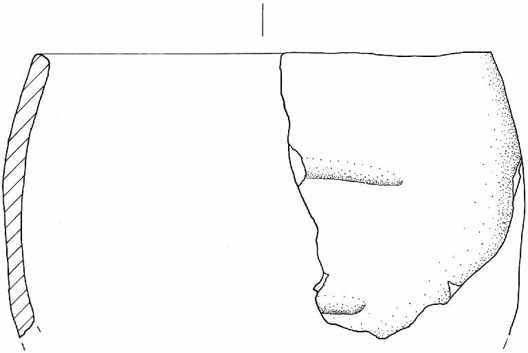 Orlo leggermente introflesso e arrotondato. Parete a profilo convesso decorata con due cordoni orizzontali, verosimilmente interpretabili come prolungamenti delle basi dell'ansa.
