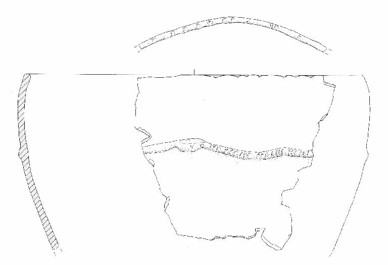 Orlo leggermente introflesso, decorato ad impressioni digitali. Parete a profilo convesso con presa orizzontale e cordone plastico serpeggiante entrambi digitati.
