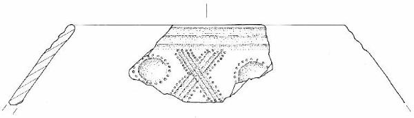 Orlo diritto. Parete superiore decorata da tre solcature orizzontali sotto l'orlo e da coppelle circolari alternate a solcature formanti un motivo a "X", entrambi i motivi sono circondati da coppelline impresse di piccole dimensioni.