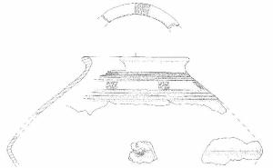 Orlo estroflesso e ingrossato decorato a solcature. Parete superiore decorata con due fasci di solcature orizzontali tra i quali si interpone un motivo a brevi solchi verticali in disposizione metopale. Piccole bugne mammelliformi sulla carena.