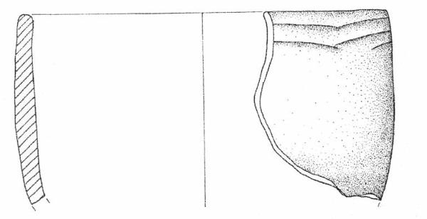 Orlo piatto, parete leggermente convessa con delle striature curvilinee prodotte sotto l'orlo. Superficie di colore grigio (10 YR 5/1).