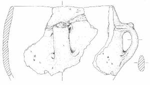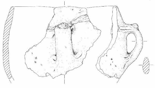 Orlo rientrante, corpo con parete ad andamento convesso, base non conservata. \nAnsa con sezione a nastro e profilo ad orecchio, con ponticello orizzontale ispessito, decorata sull'apice con un bottoncino plastico troncoconico, di fattura piuttosto sommaria, non ben sagomato.\nDalla radice superiore dell'ansa si sviluppano nelle due opposte direzioni due cordoncini plastici appena rilevati, a sinistra con andamento orizzontale, a destra arcuato con apice che corre probabilmente a sfiorare l'orlo. \nColore: marrone.