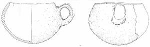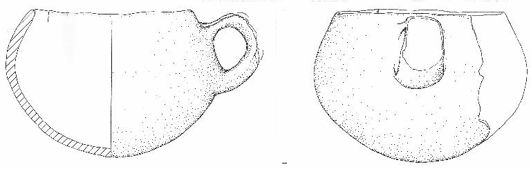Orlo arrotondato, corpo globoso-lenticolare con parete ad andamento convesso e decisamente rientrante, max espansione arrotondata posta poco sopra la metà dell'altezza, base decisamente convessa.\nReca un'ansa, leggermente lacunosa all'apice, posta poco sotto l'orlo e sulla max espansione, con sezione a nastro largo e sottile e profilo a orecchio: poteva forse recare in origine un qualche piccolo elemento plastico applicato a decorazione dell'apice, ora perduto. Colore: da grigio a bruno.