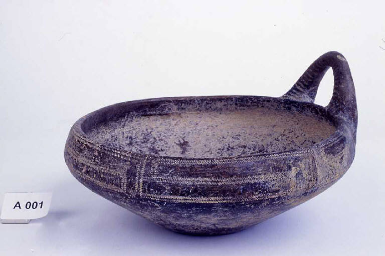 Corpo carenato apodo con decorazione impressa sotto l'orlo a rettangoli meandrici, ansa sormontante con solcature.