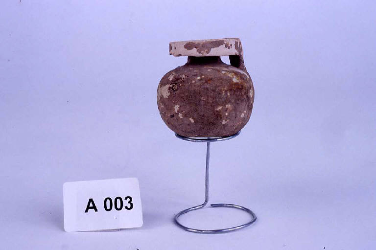 Aryballos globulare con imboccatura a disco a ansa a nastro. Decorazione illegibile.