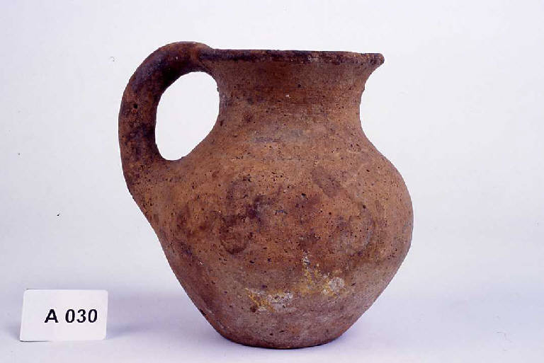 Fondo piatto corpo globulare con orlo poco estroflesso, ansa a bastoncello.