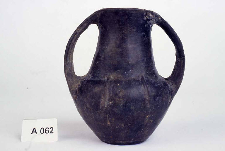 Corpo apodo biconico con spalla arrotondata alto collo a profilo concavo, anse a bastoncello impostate verticalmente dall'orlo. Decorazione a nervature sul corpo.