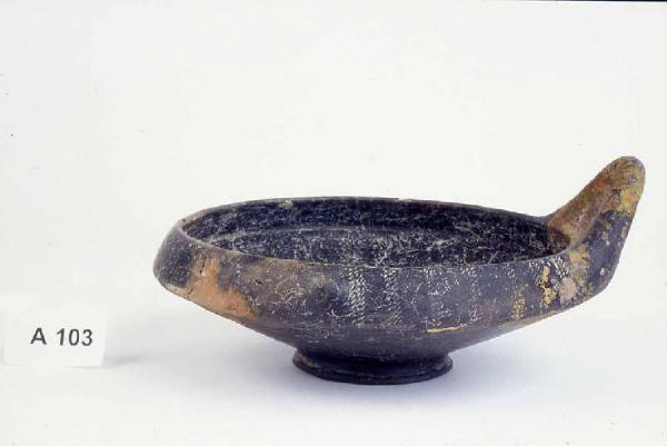 Piede svasato, vasca carenata rientrante all'orlo con ansa a bastoncello sormontante. Decorazione impressa a trattini sul corpo e solcature sull'ansa.
