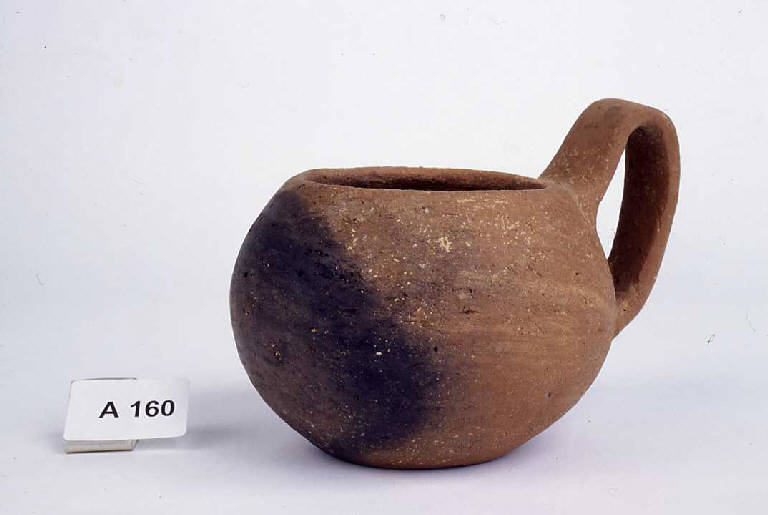 Fondo piatto, corpo globulare con ansa a nastro sormontante.