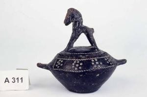 Corpo apodo biconica con anse a bastoncello impostate al punto di max espansione. Decorazione impressa a rosette e cordoncini orizzontali.