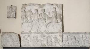 Fregio scolpito ad altorilievo suddiviso in due parti. In quella superiore è raffigurata una solenne parata di cavalieri, accompagnati da servi che tengono il morso del cavallo e che portano aste con corone. Nella parte inferiore vi è invece una scena di caccia, in cui si riconosce anche un leone.