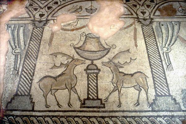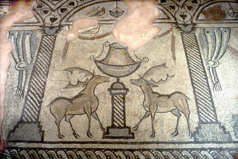 Mosaico pavimentale diviso in due settori. Il più ampio è decorato a motivi geometrici, mentre nell'altro è raffigurato un portico a tre arcate, decorate da velari, tralci di vite e uccellini. Sotto l'arcata centrale vi sono due cervi che si abbeverano ad una grande coppa (kantharos). A destra invece è raffigurato un pesonaggio maschile con tirso.