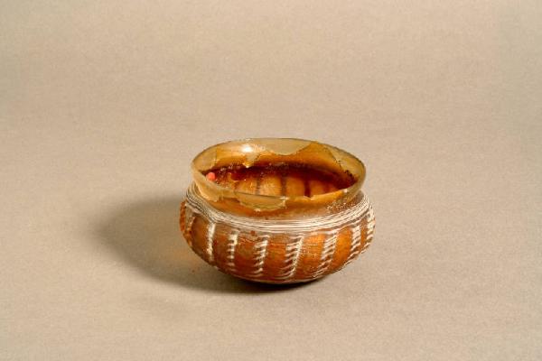 Coppa con labbro leggermente estroflesso, spalla decorata, corpo tondeggiante e schiacciato, fondo concavo. Decorazione: venature bianche sulla spalla e sul fondo, a spirale; costolature verticali venate di bianco sul corpo