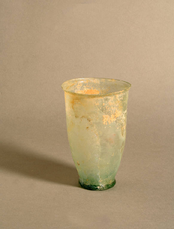 Bicchiere con labbro espanso tagliato a spigolo vivo, corpo campaniforme, parete dritta con rastremazione verso il fondo, basso piede troncoconico
