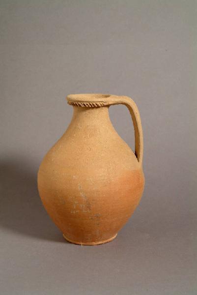 Orlo arrotondato decorato a tacche nella parte inferiore, largo collo svasato all'attacco con la spalla, corpo ovoidale, ansa costolata impostata sulla spalla e saldata all'orlo, piede ad anello