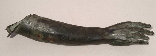 Braccio di statua virile, di grandezza lievemente superiore a quella umana, con lembo di veste