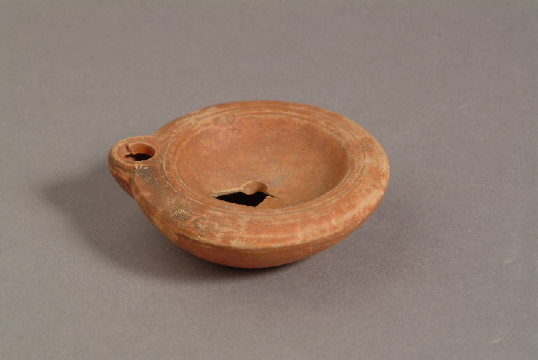 Monolicne, serbatoio troncoconico rovescio, spalla spiovente all'esterno, disco concavo delimitato da due cerchi impressi, becco tondo, fondo piano con cerchio impresso al cui interno sta un secondo cerchio impresso puntato