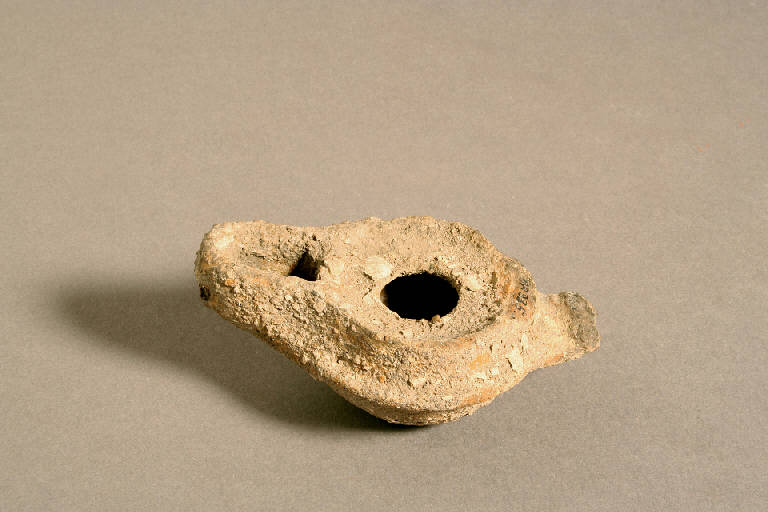 Monolicne, corpo carenato, traccia d'impostazione di ansa a nastro, disco tondeggiante, largo foro di alimentazione, canale aperto di forma degenerata, parte inferiore alta e bombata, tracce di invetriatura sul fondo