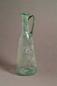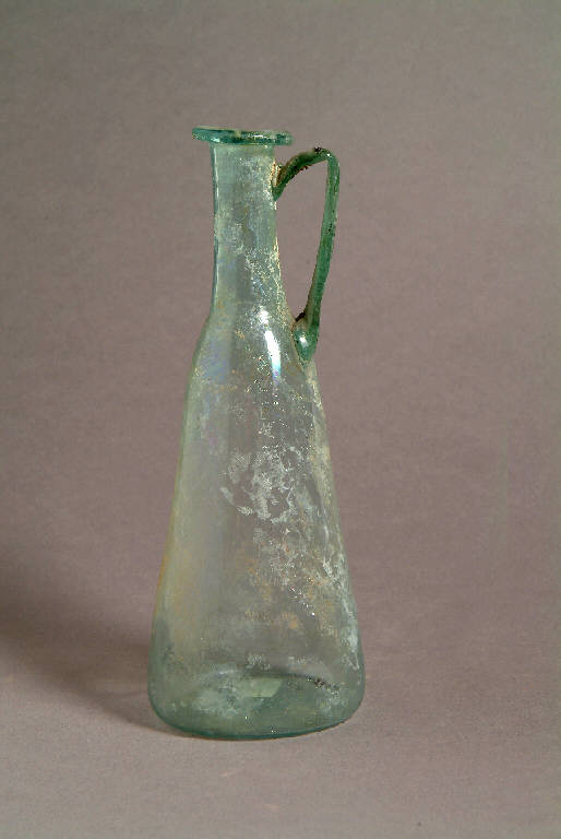 Orlo ripiegato a cordoncino orizzontale, lungo collo cilindrico con leggera strozzatura all'attacco del ventre conico su base concava, ansa a nastro bifida impostata sulla spalla e saldata sotto l'orlo