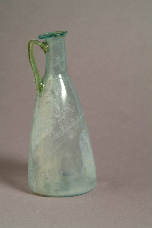 Orlo ripiegato a cordoncino orizzontale, lungo collo cilindrico con leggera strozzatura all'attacco del ventre conico su base concava, ansa a nastro bifida impostata sulla spalla e saldata sotto l'orlo