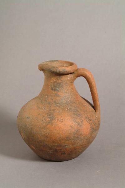 Orlo arrotondato, largo collo svasato, corpo ovoidale a spalla rialzata, ansa impostata sulla spalla e saldata al di sotto dell'orlo, apoda