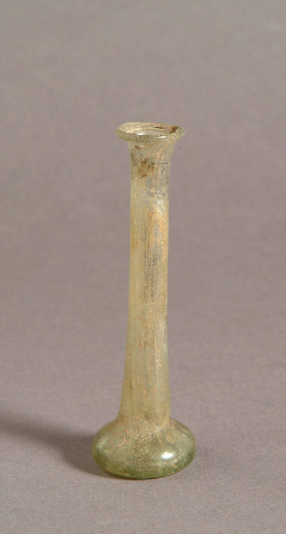 Orlo orizzontale ripiegato a cordoncino, lungo collo cilindrico con lieve strozzatura alla base, corpo schiacciato, base concava