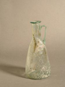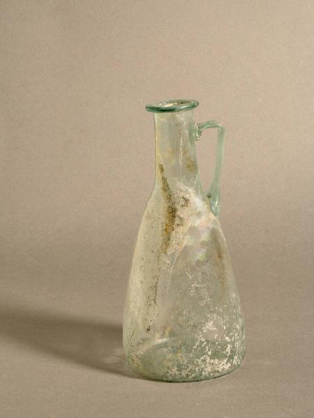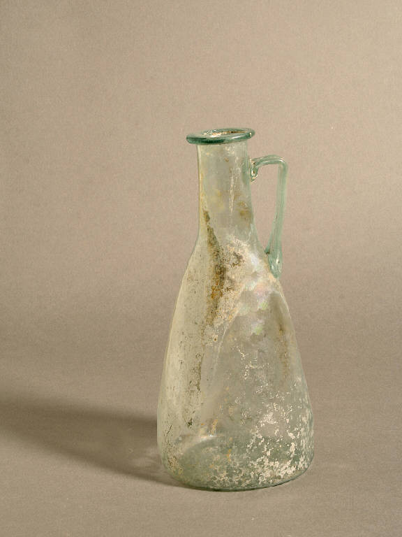 Orlo orizzontale ripiegato a cordoncino, collo cilindrico svasato alla base, corpo piriforme su base concava, ansa a nastro impostata sulla spalla e saldata al di sotto dell'orlo