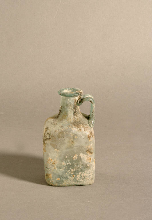 Orlo orizzontale ripiegato a cordoncino, collo cilindrico svasato alla base, corpo quadrato con spalla arrotondata, ansa a nastro impostata sulla spalla e saldata al di sotto dell'orlo, fondo piano