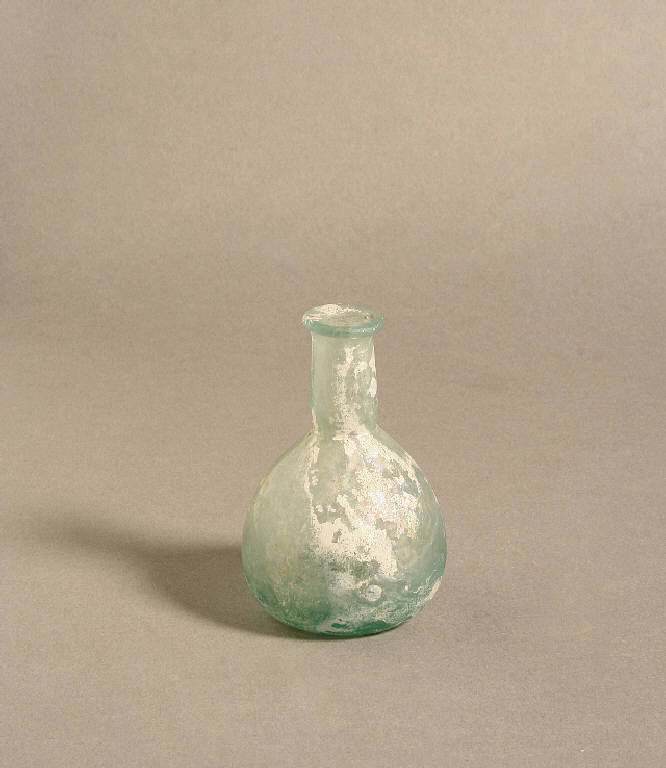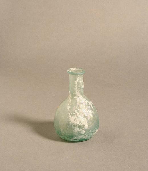 Orlo ripiegato a cordoncino, collo cilindrico con strozzatura alla base, corpo sferico su base concava