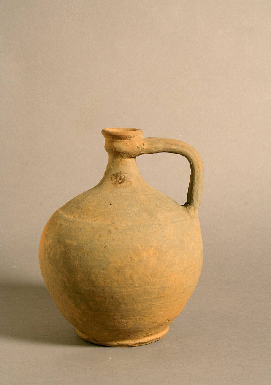 Orlo estroflesso, collo conico molto stretto, corpo globulare, spalla delimitata da due solcature parallele, ansa a nastro scanalato ad angolo retto impostata dal collo sulla spalla, piede ad anello