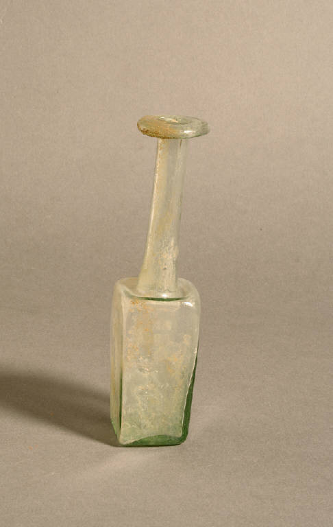 Ampio orlo estroflesso, lungo collo cilindrico, spalla piana con spigoli smussati, corpo a parallelepipedo allungato e poco rastremato verso il fondo, fondo piano con marchio impresso