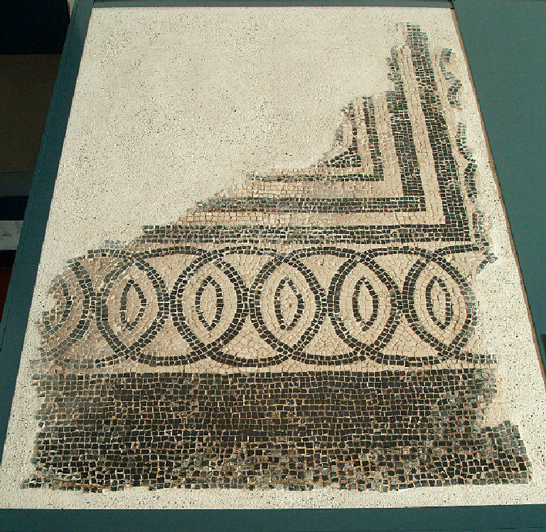 Frammento di mosaico pavimentale geometrico con tessere bianche e nere a cerchi intersecantisi e cerchi con motivi crociati