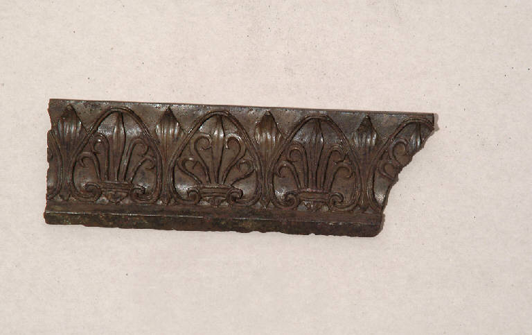 Cinque frammenti distinti di cornice con profilo a gola rovescia e motivo decorativo in rilievo, costituito da palmette alternate a foglie lanceolate
