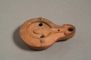 Monolicne, spalla leggermente spiovente con tre borchie non forate, disco a canale aperto con due fori di alimentazione. Decorazione: due cerchi concentrici a rilievo sul fondo