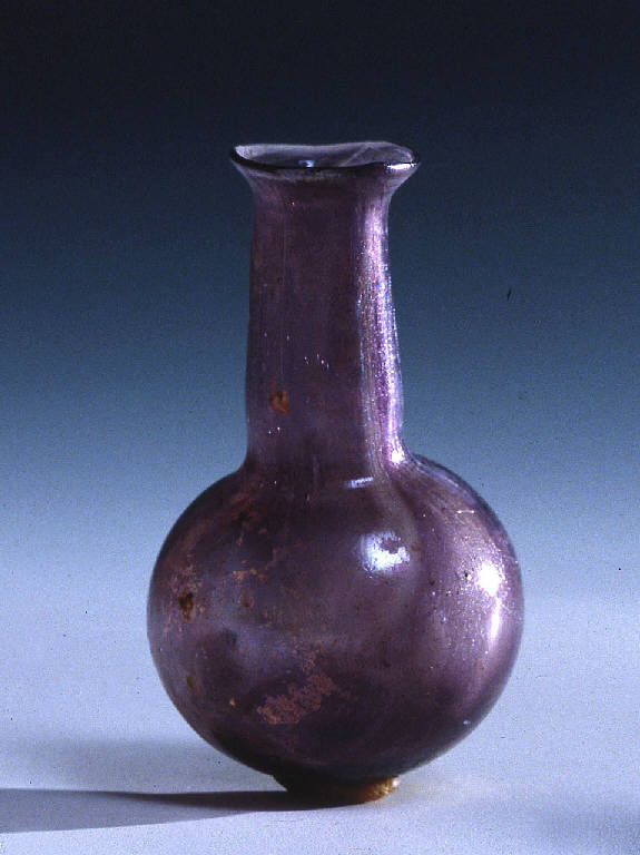 Orlo estroflesso, a forma di imbuto, tagliato e arrotondato, lungo collo cilindrico con strozzatura all'attacco con il corpo sferico con base arrotondata